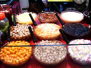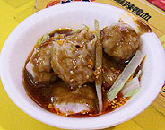 ![]() 台湾でポピュラーなデザートの一つ、芋圓。数種類の具(写真)から好きなのを選んで、小豆やピーナツを煮た甘いスープをかけて食べる。味は日本のお汁粉に似てるけど、お汁粉よりも甘さひかえめ。熱いままでも冷やしても。 |