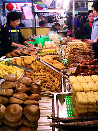 ![]() この「臭豆腐」なる食品、初めて見たときはセンセーショナルだった。豆という字が「臭」と「腐」に挟まれて、字面からしてすごいくさそう。外見は日本の厚揚げに似ている。食べてないので味はわからないけど、くさくはないもよう。 |