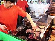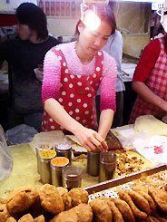 これはちょっとおもしろい、ジャンクフードのお店。注文すると、写真の手前に見える揚げパン、これをお店の人が拳で粗く砕いて、薄焼きのクレープで巻いて手渡してくれる。砕けた揚げパンのざくざくした食感が楽しい、駄菓子的食品。「大餅包小餅」という。写真の後方では、スタッフが揚げパンおよびクレープの生地を作っている。たかが屋台売りのジャンクフードなのに(失礼)、オール自家製、しかも作りたてという、ぜいたくなようなそうでないような。 | |